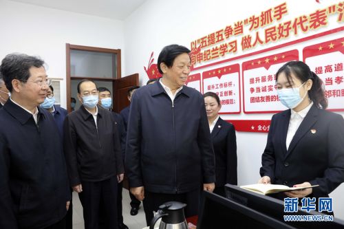 11月16日至18日,中共中央政治局常委、全国人大常委会委员长栗战书在山西调研。这是11月17日,栗战书在长治一处街道人大机关考察。新华社记者 刘卫兵 摄