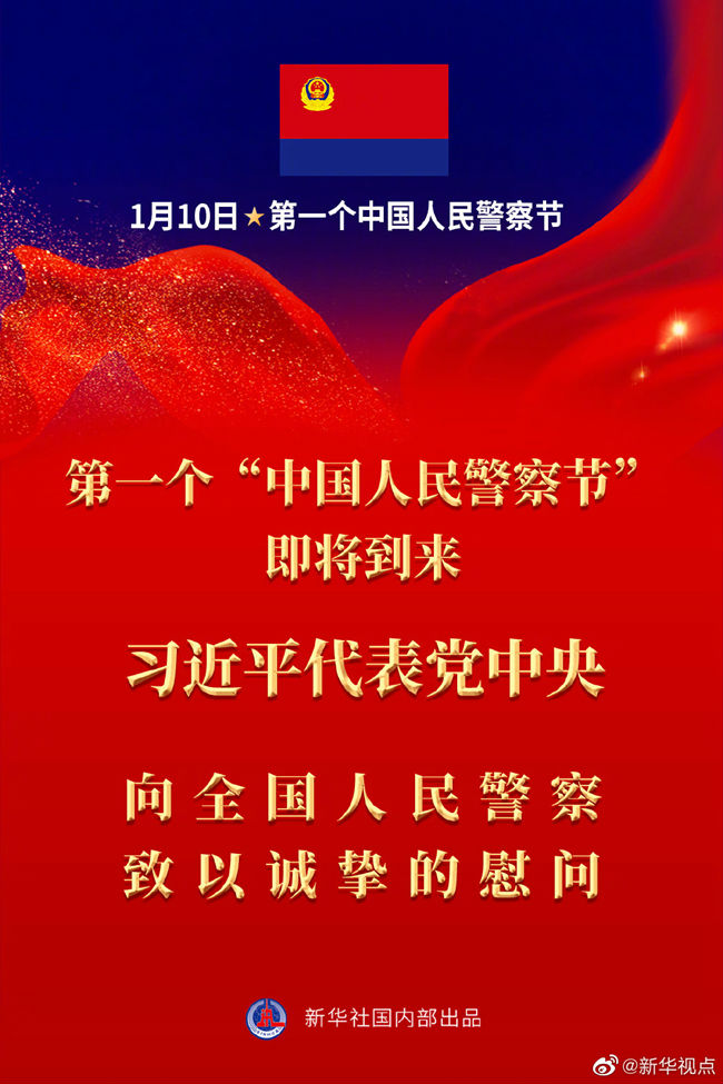 第一个“中国人民警察节”即将到来,习近平代表党中央,向全国人民警察致以诚挚的慰问。希望大家以实际行动践行对党忠诚、服务人民、执法公正、纪律严明,努力建设更高水平的平安中国、法治中国,为保障人民幸福、国家安全、社会稳定作出新的更大贡献,以优异成绩庆祝建党100周年。