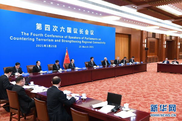 3月25日,全国人大常委会委员长栗战书在北京人民大会堂以视频方式出席第四次六国议长会议并发表讲话。新华社记者 饶爱民 摄