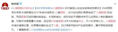 #人猴胚胎计划中止#【#科学家培育出人猴胚胎# 反对者担心出生后或有自我意识】59岁西班牙科学家卡洛斯曾在2017年成功培养出“人猪胚胎”,如今他与团队再度完成了“人猴胚胎”的实验,而且胚胎已成形随时能诞生。卡洛斯指出,成形后的干细胞将来可以应用在人类的器官移植,对医疗发展是重大突破。但这项计划在胚胎14天大时被迫中止,不少科学家认为,人猴胚胎会违反道德伦理,如果最后真的生出了人猴,它们很有可能会产生自我意识,最终导致自我毁灭。(看看新闻)