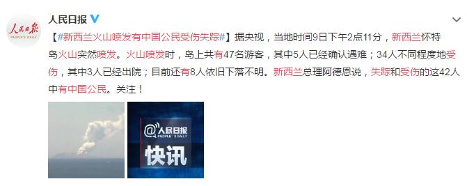 【#新西兰火山喷发有中国公民受伤失踪#】据央视,当地时间9日下午2点11分,新西兰怀特岛火山突然喷发。火山喷发时,岛上共有47名游客,其中5人已经确认遇难;34人不同程度地受伤,其中3人已经出院;目前还有8人依旧下落不明。新西兰总理阿德恩说,失踪和受伤的这42人中有中国公民。关注!