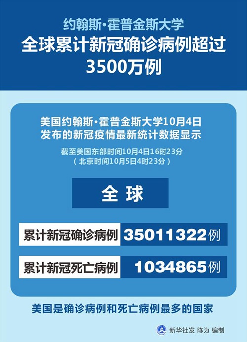 新华社纽约10月4日电 美国约翰斯·霍普金斯大学4日发布的新冠疫情最新统计数据显示,截至美国东部时间4日16时23分(北京时间5日4时23分),全球累计新冠确诊病例超过3500万例,达35011322例,累计死亡病例1034865例。