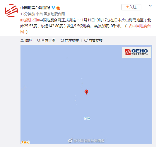 中国地震台网正式测定,11月11日13时17分在日本火山列岛地区(北纬25.53度,东经142.80度)发生5.5级地震,震源深度10千米。