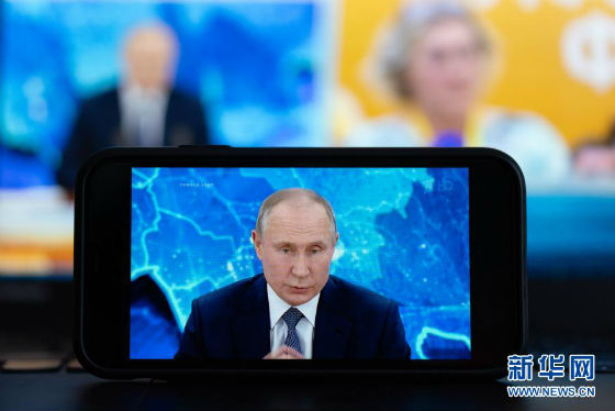 这是12月17日在俄罗斯首都莫斯科拍摄的普京年度记者会直播画面。新华社记者 白雪骐 摄