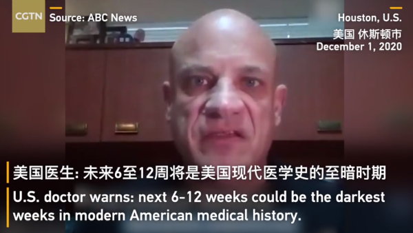 就在本月初,休斯敦联合纪念医疗中心首席医疗官约瑟夫·瓦龙在接受采访时称:“接下来的六周将是美国现代医学史上的至暗时刻。我们正处于传统假期,而人们(对防疫规定)听不进去。”