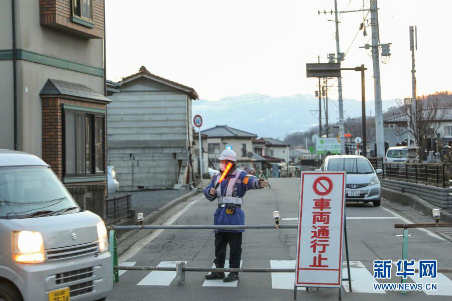 2月14日,日本福岛县桑折町一处因地震受损的房屋附近道路被封锁。新华社记者 杜潇逸 摄