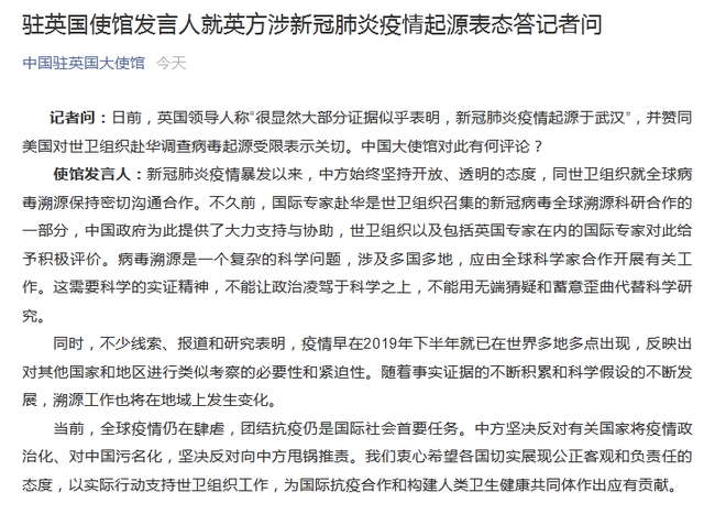 记者问:日前,英国领导人称“很显然大部分证据似乎表明,新冠肺炎疫情起源于武汉”,并赞同美国对世卫组织赴华调查病毒起源受限表示关切。中国大使馆对此有何评论?
