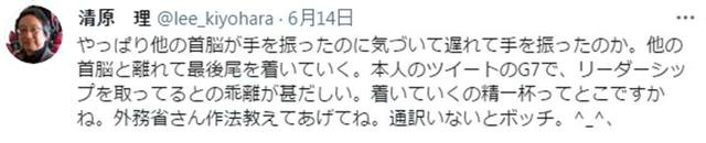 “果然是发现其他领导人挥手致意之后才迟了一拍挥手。离场的时候也离开其他的领导人跟在最后面,(菅义伟)本人的推特上称要在G7上起领导作用,与现实之间存在很大的差距。跟在后面就是最大的努力了么。外务省教教他基础礼节吧,没有翻译就是个孤零零的人”【环球网报道见习记者 林泽宇】