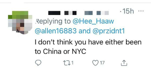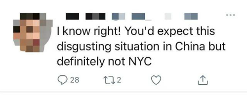 不仅如此,他还在另一条转发这则视频的推特下面留下了类似的评论,声称:“可不是吗!你会想到这种恶心的情景发生在中国,但绝不会想到是在纽约。”↓