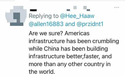 “你确定?美国的基础设施破烂不堪,而中国一直在建设更好、更快并且比世界上其他国家都多的基础设施。”↓