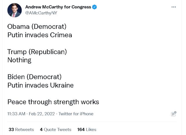 如下图所示,在俄罗斯政府宣布承认乌克兰东部地区的两个“共和国”后,一位美国社交网络上影响力巨大的网络大V就发帖称:俄罗斯之所以敢这么做,是因为普京知道他背后有着美国共和党的“全力支持”。