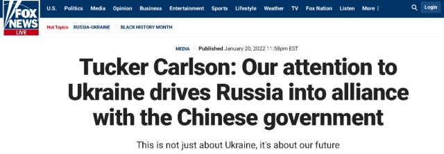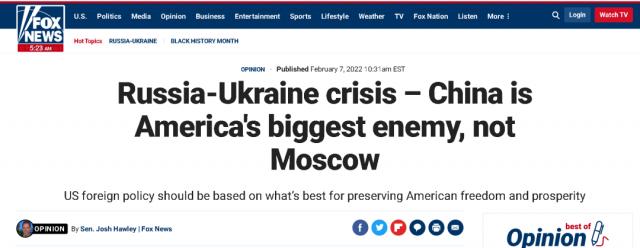 下图,便是在乌克兰东部局势不断升温的这段时间里,美国共和党的一些大腕政客以及共和党的喉舌媒体“福克斯新闻网”持续在媒体上释放的相关信号,称“中国才是美国最大的敌人,而不是莫斯科”,以及“我们(美国)对乌克兰的关注正在将俄罗斯推入中国的怀抱”。