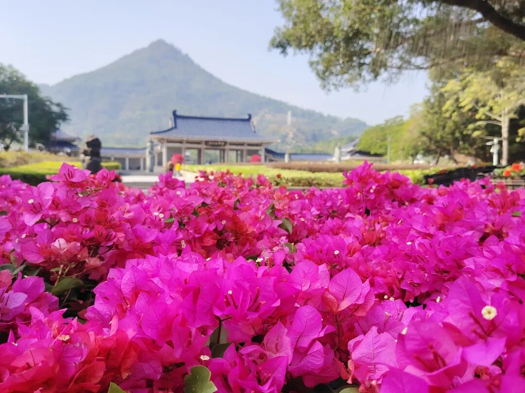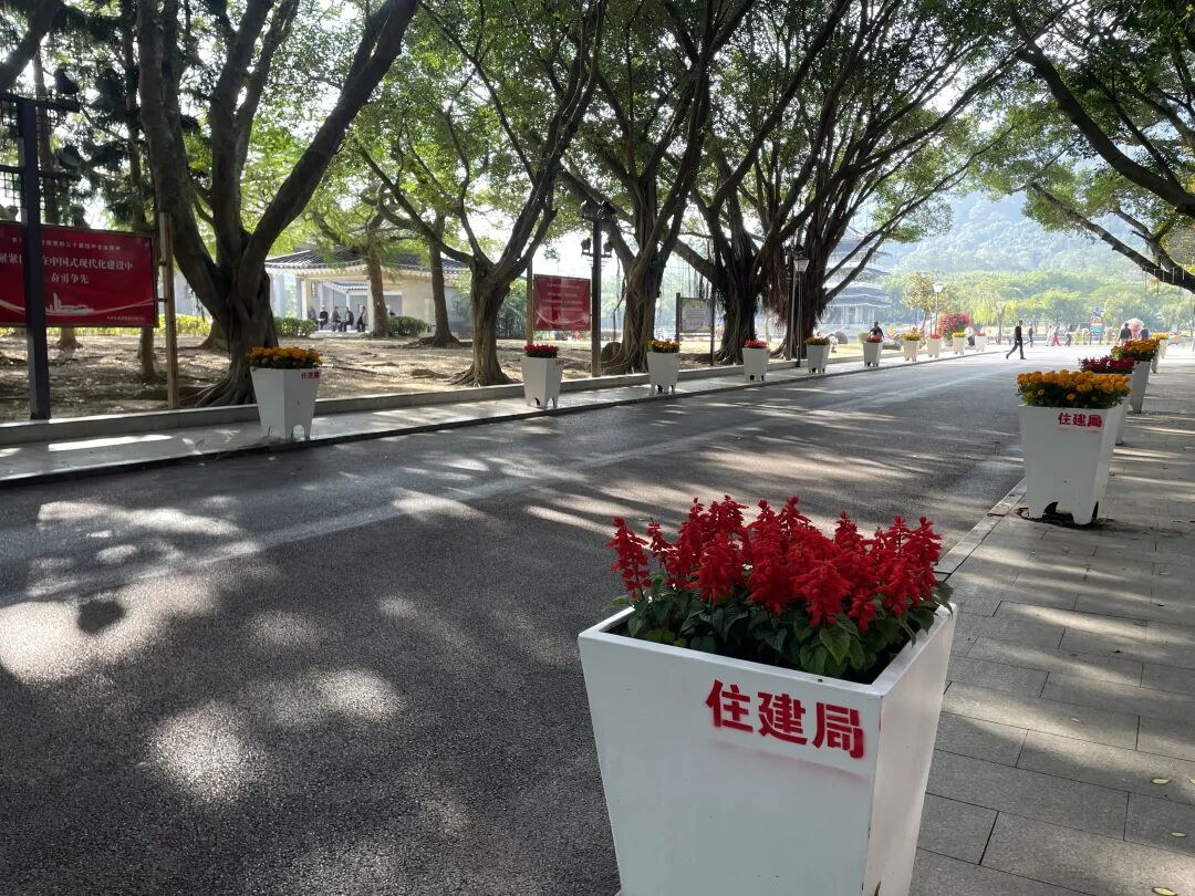 各色三角梅热烈绽放,红粉紫白的花簇如瀑倾泻;报年红赤红成团,明艳夺目;一串红成列挺立,花穗似火炬般热烈;美国大石竹花型饱满,花色清丽雅致;矮牵牛铺展成彩色绒毯,柔美烂漫;黄橙孔雀草点缀其间,金黄橙红的小花灵动亮眼。各类花草依造型错落排布,既体现花卉多样性,又通过景观巧思传递城市文明,为市民游客带来独特视觉体验。