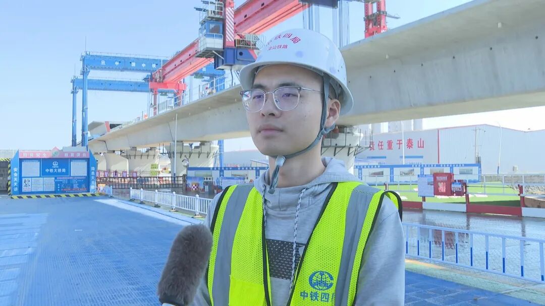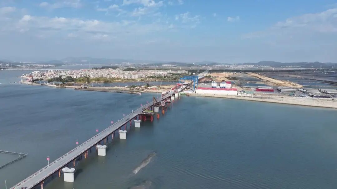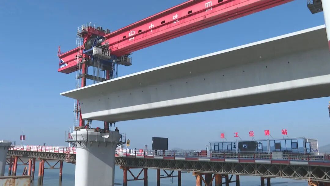 漳汕高铁福建段东山制梁场技术主管 谢世杰:首次架设的这片箱梁重达近1000吨,海上架梁受风浪影响较大,对设备稳定性、操作精准度要求苛刻,作业环境更为复杂,难度比陆地施工更大。