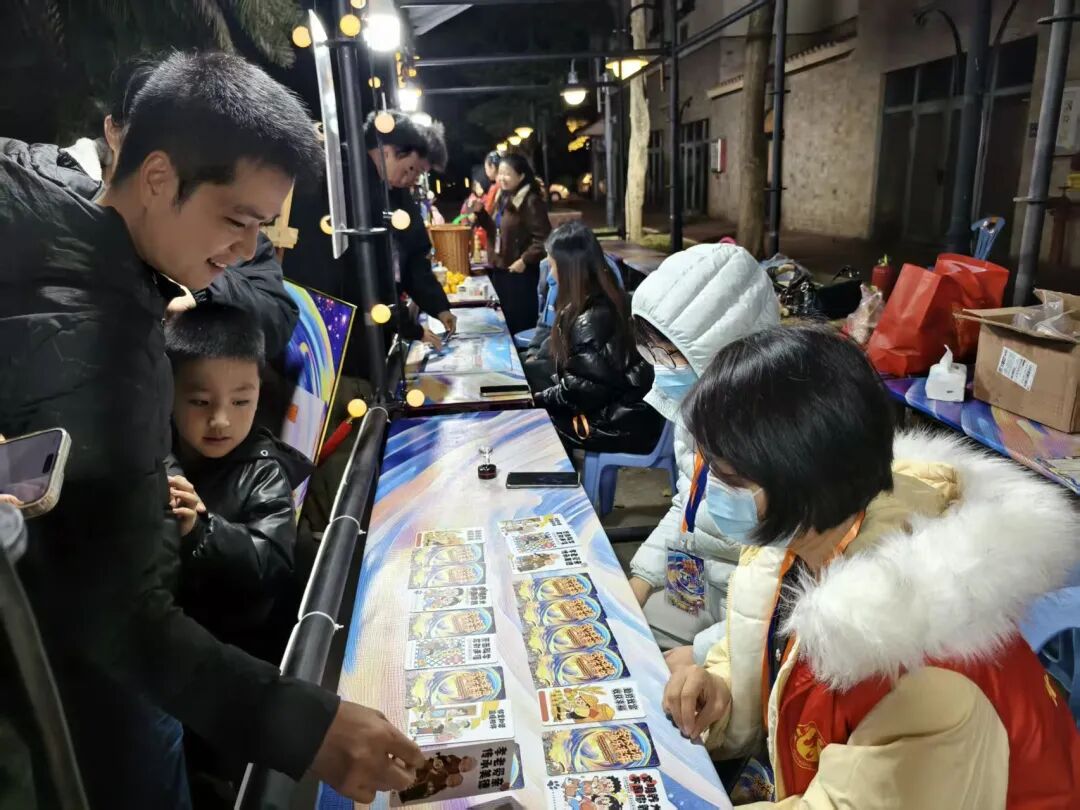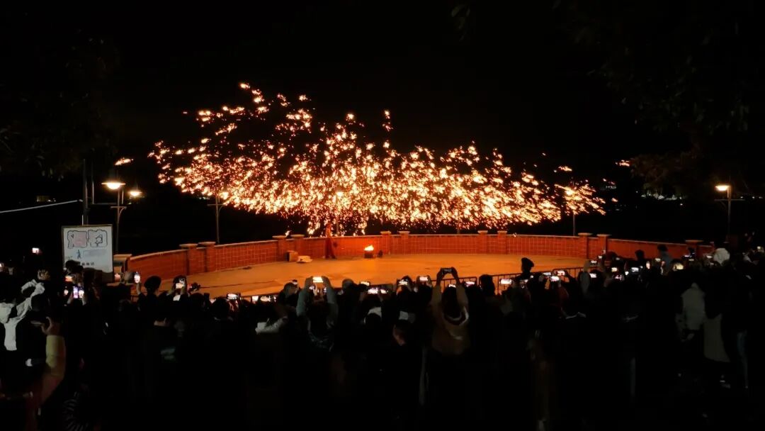 沉浸式体验环节更是惊喜不断,让游客在游走中深度感受文化魅力。汉服巡游两度精彩上演,身着传统汉服的表演者漫步景区,光影摇曳间尽显古风雅韵;潮剧展演将地方非遗文化融入活动场景,演员们身着精美戏服,唱腔婉转悠扬,让观众近距离感受传统戏曲的独特魅力;震撼人心的打铁花表演惊艳全场,高温铁水在匠人手中绽放成璀璨花火,带来强烈的视觉冲击;跨年夜的孔明灯放飞仪式与烟花秀,更是将活动推向高潮。据了解,本次孔明灯放飞活动共准备450盏电子孔明灯,游客可通过参与指定互动游戏集章领取,23时许,承载着众人美好祝愿的孔明灯缓缓升空,零点烟花接续绽放,共同启封新岁,照亮此行的每一寸光华,定格下辞旧迎新的温馨瞬间。