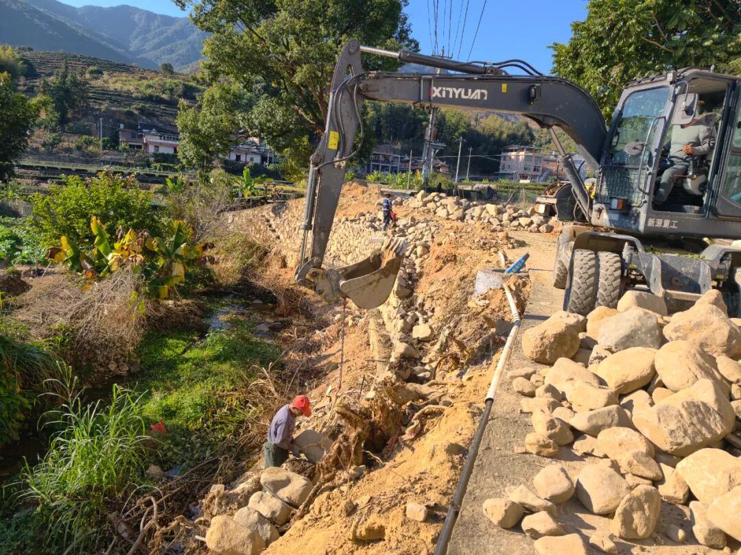 近日,仙都镇下林村河岸沿线一派繁忙建设景象,挖掘机机械臂精准起落,石块被有序放至河岸坡面,原本松动的堤岸正以稳固姿态守护村落与溪流。