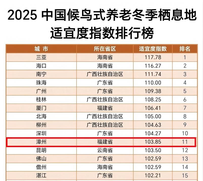 漳州位列《2025中国候鸟式养老冬季栖息地适宜度指数》第十一名,福建省第二名