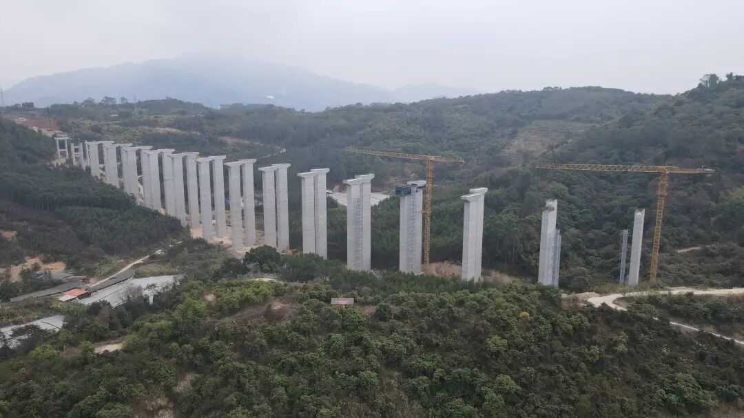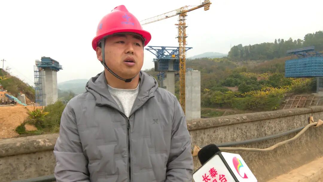 我们现在a段的话,像隧道、桥梁已经全部施工完成,路基正在进行一个填方施工;b段的话,像我身后魁母岫大桥下构已经全部完成施工,正在进行一个悬浇挂篮的施工,新村大桥下构也基本完成施工,新华分离式立交桥,然后正在进行一个桩基和下构的一个同步施工,我们梁场(T梁预制场)现在正在进行一个建设,预计在年底前完成一个临建,完成首片T梁的一个浇筑,整体项目施工进度预计在2026年的11月份完成一个通车。