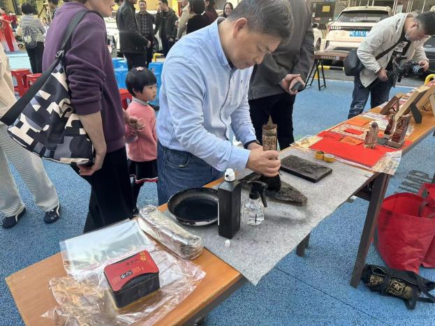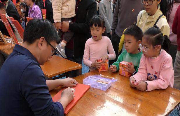 非遗展演区里,多项漳州本土非遗项目依次亮相。省级非遗传承人颜朝俊现场演示木版年画印制全流程,手持棕刷蘸取油墨均匀涂抹雕版,覆上红纸轻刷数下,福禄寿喜、年年有余等吉祥图案便跃然纸上,不少居民排队体验这门传统技艺。另一边,闽南木刻大漆工作室的吴仔新带来多件精美作品,他细致讲解从原木选材、雕刻刀法,到大漆髹涂、打磨、推光的复杂工序,古朴纹理与温润漆色交融,尽显闽南传统工艺的厚重质感与独特美学。漳州八宝印泥有限公司的技艺传承人在展位生动地讲解印泥的历史渊源与制作精髓,还手把手指导大家制作八宝印泥文创产品,精练的操作演示搭配生动讲解,每一步都尽显匠心,让居民沉浸式领略这项非遗工艺的独特魅力。不远处的义写春联展位墨香四溢,芗城区书法家协会的书法家们挥毫泼墨,笔力遒劲的春联与饱满喜庆的“福”字接连出炉,居民们或驻足观赏,或挑选心仪内容,拿到作品后喜笑颜开,现场一派欢乐祥和。