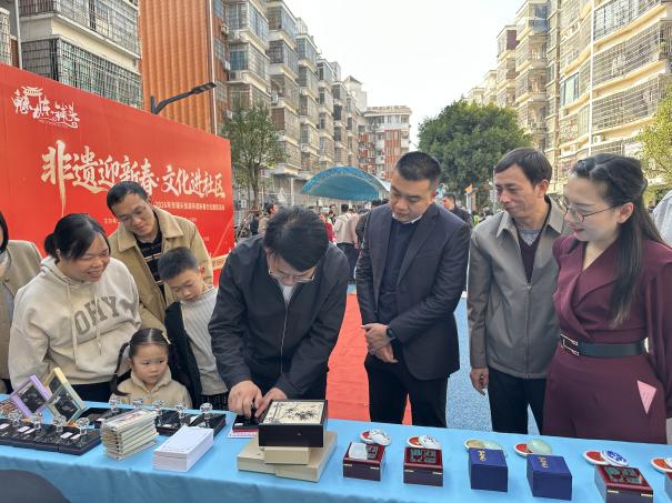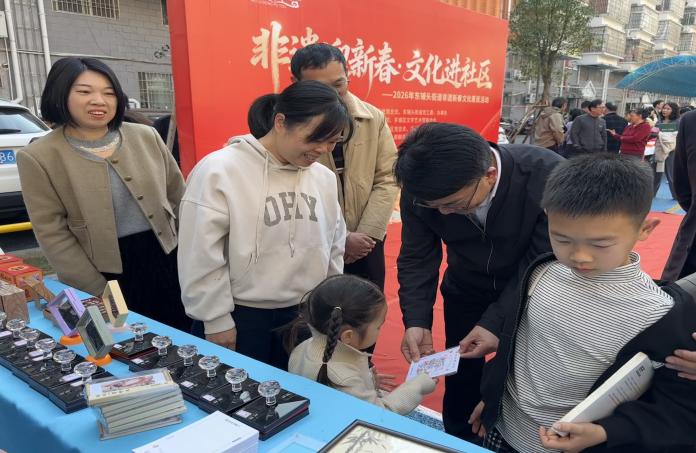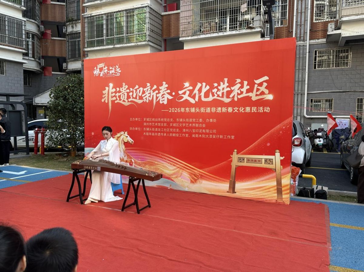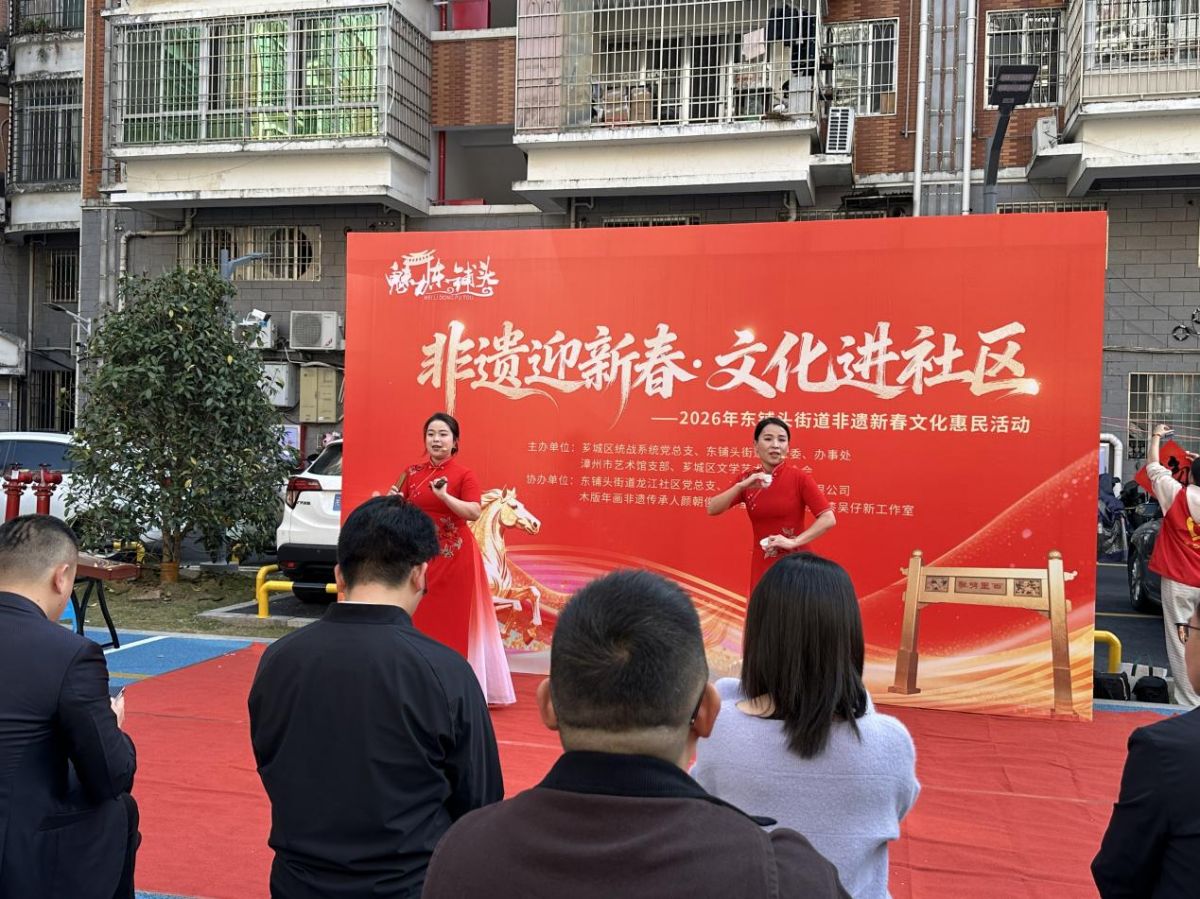 神驹献瑞,非遗贺岁。2月4日下午,改造一新的东铺头街道龙江社区高信花园小区广场鼓乐声声、年味浓浓。由东铺头街道党工委、办事处联合芗城区统战系统党总支、漳州市艺术馆支部、芗城区文学艺术界联合会主办,东铺头街道龙江社区党总支、芗城区书法家协会、漳州八宝印泥有限公司、木版年画非遗传承人颜朝俊工作室、闽南木刻大漆吴仔新工作室协办的“非遗迎新春・文化进社区”2026年非遗新春文化惠民活动在此热闹启幕。