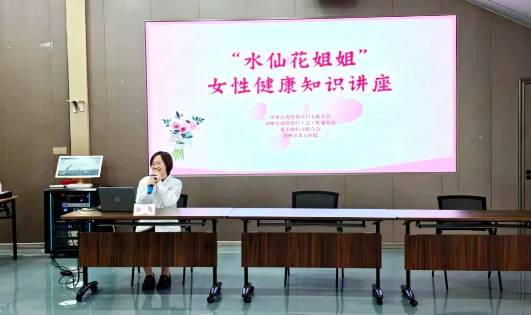 活动还邀请漳州市第五医院的医生为各级妇联组织代表、女台胞们开展“水仙花姐姐”女性健康知识讲座,围绕更年期、甲状腺、乳腺结节等常见疾病的日常保健、疾病预防展开科普,用贴心的科普为女性健康保驾护航,传递妇联组织的暖心关怀。