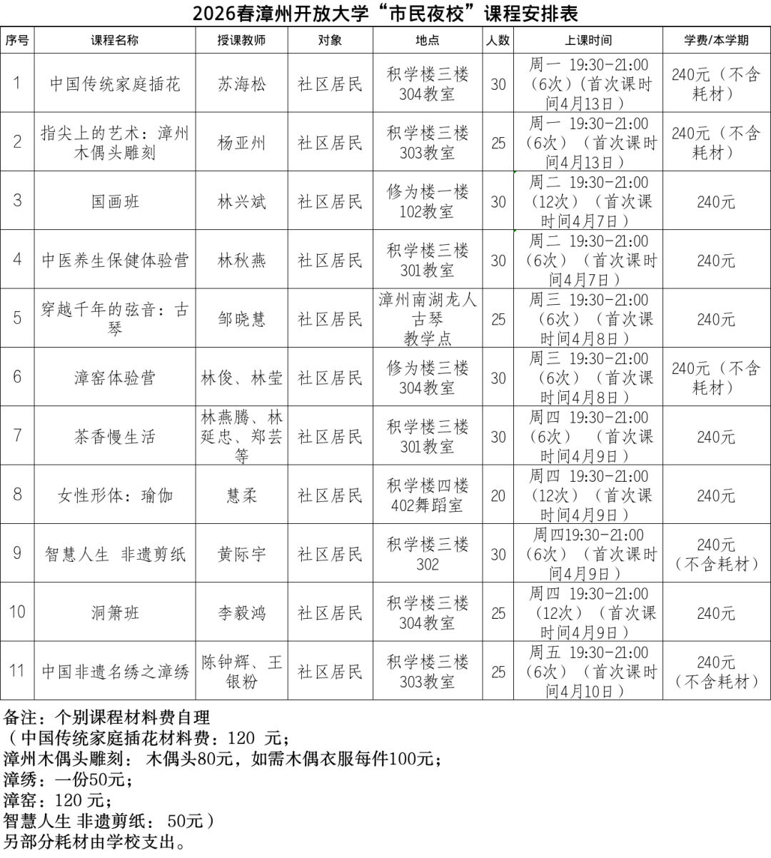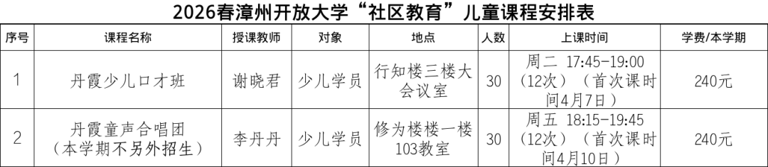 闽南网3月31日讯(闽南网记者 张恩培)为丰富社区居民精神文化生活,提升少儿语言表达能力,满足不同群体的学习需求,漳州开放大学“市民夜校”正式启动招生工作,涵盖面向社区居民的通用课程及专属少儿的丹霞少儿口才班,现将具体招生详情公告如下,诚邀符合条件的市民、少儿踊跃报名,共赴学习之约。