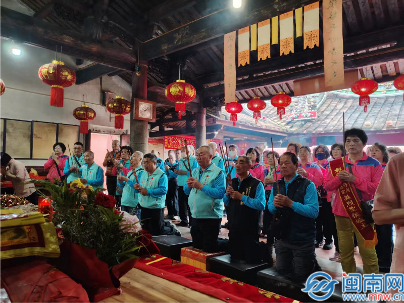 当天,长泰区武安镇南岳正顺庙迎来彰化泰源宫一行73名台胞前来谒祖参香。两地宫庙因共同的“圣侯公”(长泰历史人物陈耸)信仰,多年来保持着紧密联系。圣侯公民间信俗始于660多年前的长泰正顺庙,清雍正年间,有不少长泰人移居台湾,将正顺庙香火传播到彰化桃源里,并于1979年建庙“泰源宫”(寓意源自长泰)。从1989年起,居于桃源里的林、陈、王、曾、曹、蔡诸姓乡亲,先后多次组团回长泰访祖,祭奠圣侯公。
