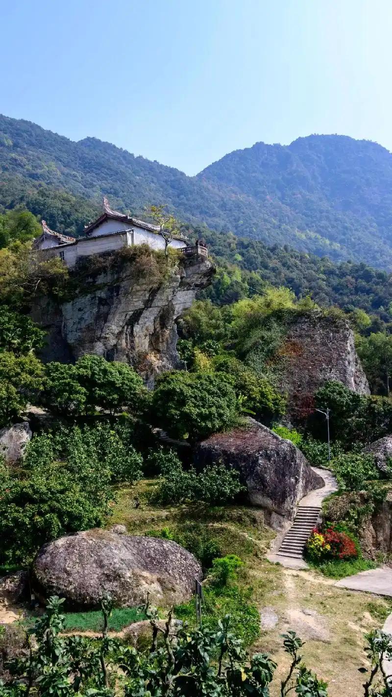 这座位于大溪镇石寨村的朝天寺,始建于宋代建隆三年(公元962年),迄今已有千年的悠久历史。寺庙坐落于大峰山南麓一块巨石之巅,整座建筑巍然屹立在冲天崖颠,远远望去犹如一只昂首张口的巨蟒,地势之奇、视觉之险令人叹为观止。登上古寺,站在崖颠俯瞰,周围峰峦叠嶂、深谷清泉尽收眼底,极具“小黄山”的险峻韵味。