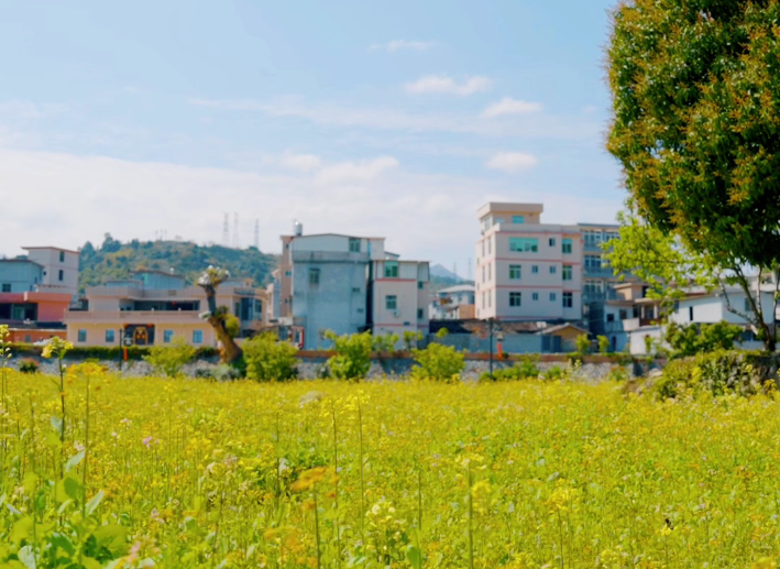 映入眼帘的是连片的七彩油菜花。