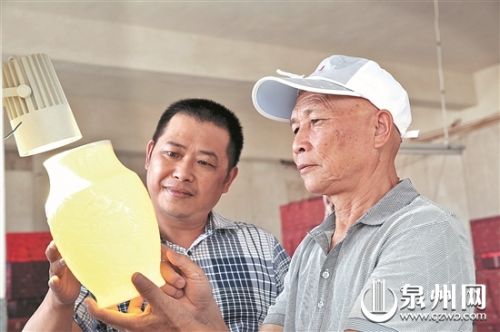 寇富平(右)和儿子寇建勋一起探讨创作“建白瓷”艺术品