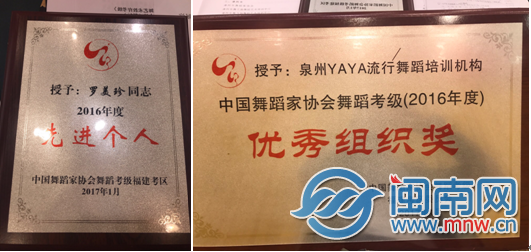 同时,泉州丫丫流行舞蹈培训中心荣获中国舞蹈家协会舞蹈考级福建考区2016年度优秀组织单位,且该单位罗美珍(默默)老师荣获2016年度先进个人。