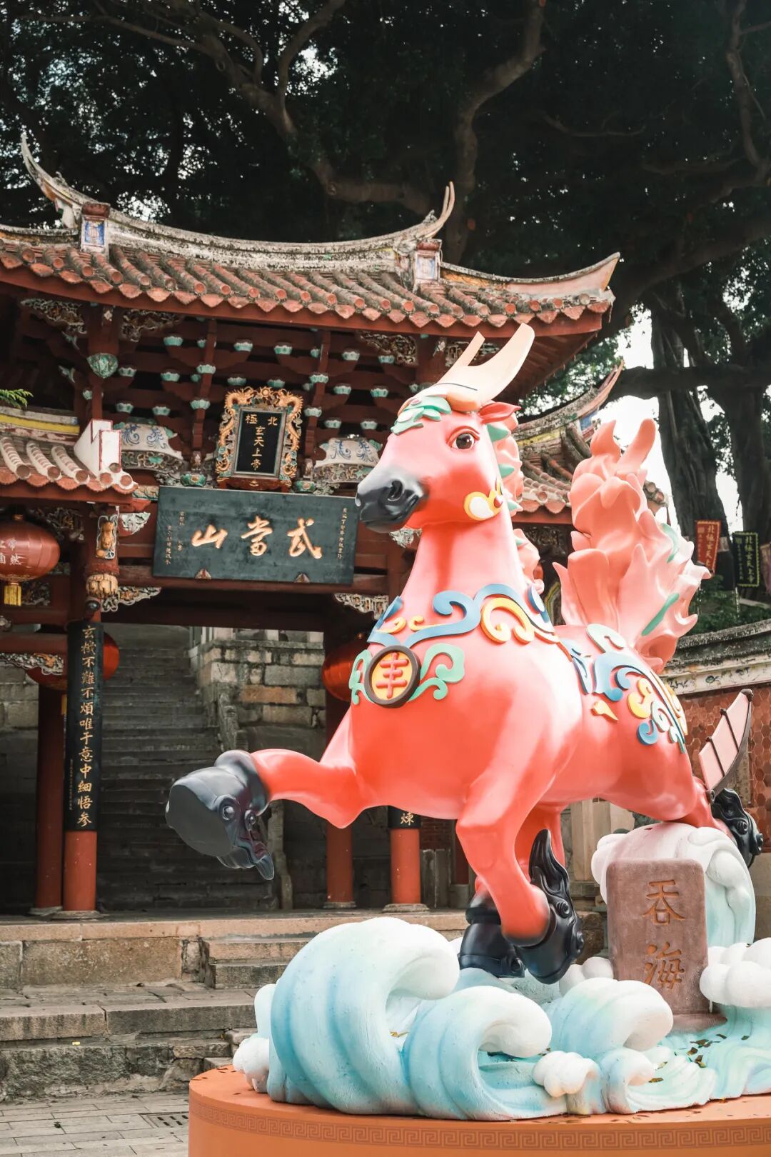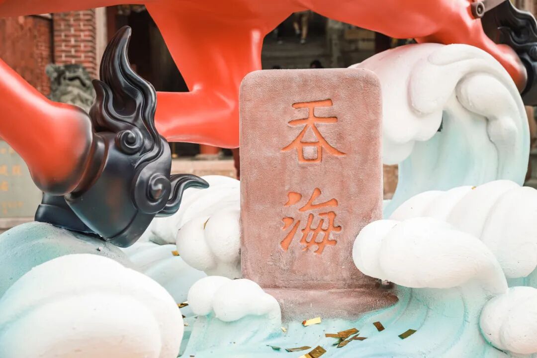 此次落成的马年IP艺术装置,以“凌波骐骥·福佑平安”为内核,巧妙融合真武庙文化与海丝精神。装置造型汲取“马踏飞燕”之灵动神韵,立“吞海”巨石之侧,身披真武庙祥瑞窗花纹,以福船帆为双翼,凌空飞腾,气可吞海的气势,象征着向海而生的勇气和胆魄,形态昂首向前,腿蹄轻捷,三足腾空,飞驰向前,表现出骏马凌空飞腾、奔跑疾速的雄姿,传递“时和岁丰、福运绵长”的美好寓意。