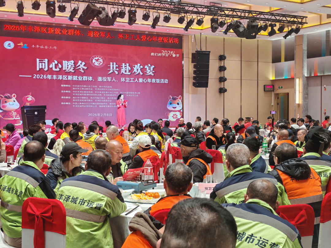 为感谢默默奉献的环卫工人、保家卫国的退役军人以及为城市发展辛勤付出的新就业群体,增强他们的归属感和幸福感,促进社会和谐共融,弘扬志愿服务精神,近日,“同心暖冬·共赴欢宴”——2026年丰泽区新就业群体、退役军人、环卫工人爱心年夜饭活动举办。