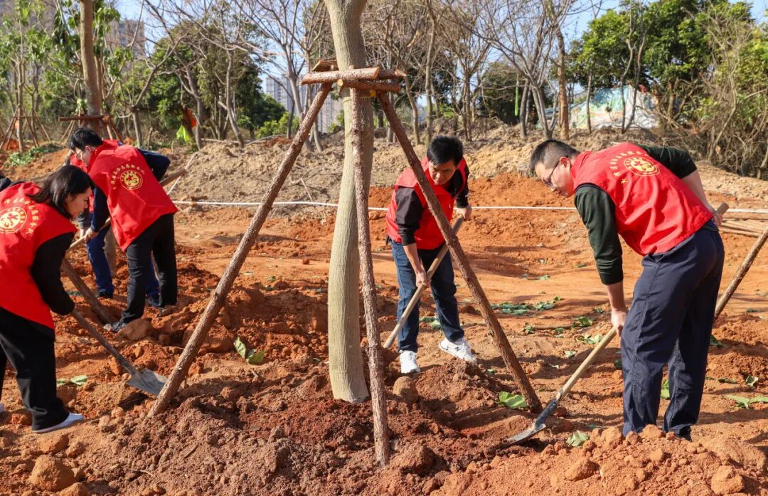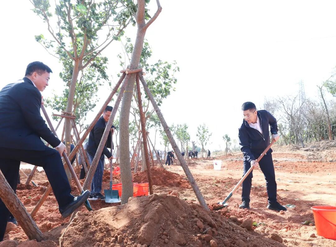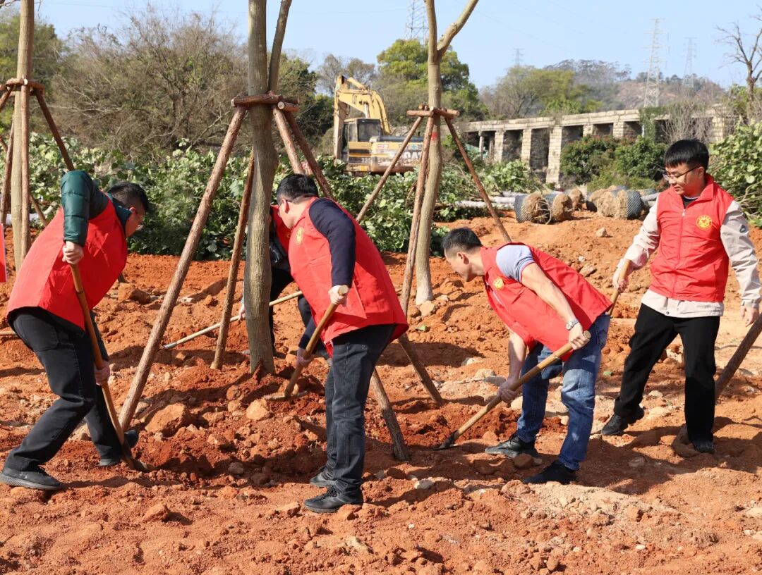 迎着和煦春风,植树现场一派热火朝天的劳动景象。大家挥锹铲土、扶苗填坑,每一道工序都一丝不苟,确保栽种好每一棵新苗。