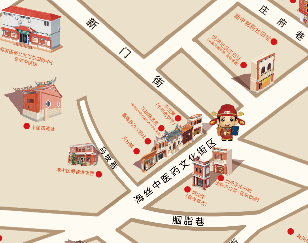 整张地图色调温暖雅致,以中山路为轴,覆盖泉州古城核心区域。东西塔、府文庙等地标清晰可辨,古城各处的中医医疗机构,以及散落于西街、中山路等街巷的老字号药铺等三十余处中医药文化节点,通过特色手绘建筑图标详细标注,与古城世遗点有机融合,为市民游客游览古城、寻访老药铺、体验中医服务、领略中医药文化底蕴提供清晰的点位指引。