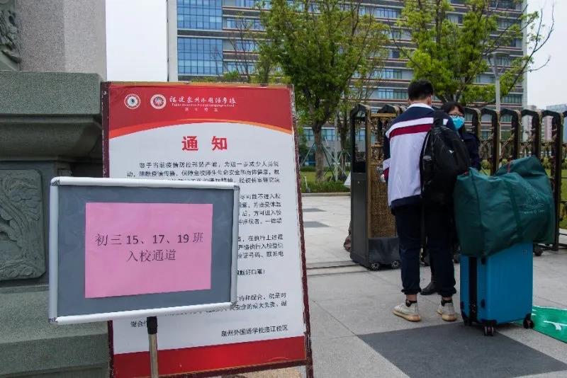 泉州第十一中学有438名初三学生在21日重返校园,由于实行错峰开学,早上八点至八点四十,学生们按照学校规定的时间返学,测量体温、登记信息、消杀……开学首日,一切井然有序。