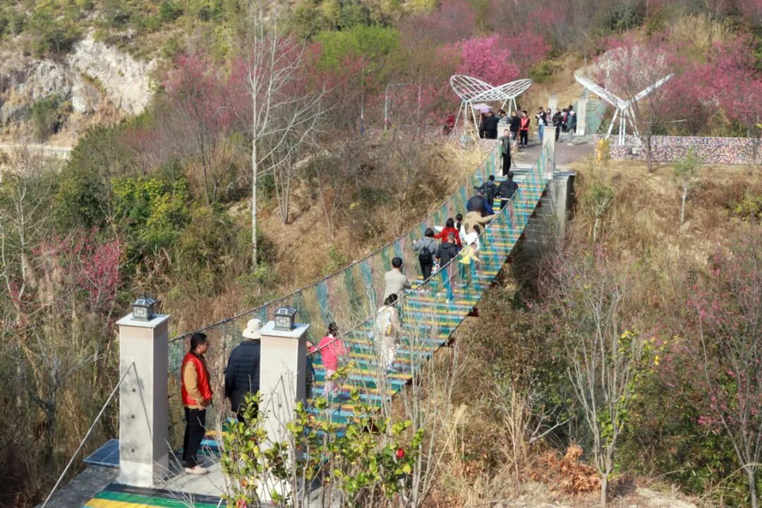 上午9时20分,伴随着一声清亮的开锣,新春登高赏樱活动在洪四村牛垅山樱花园正式拉开序幕。市民游客们手持“集章卡”,沿着规划路线拾级而上,途经彩虹桥、樱花山观景台、红色党建长廊、军装馆等地,最终抵达洪四影剧院。