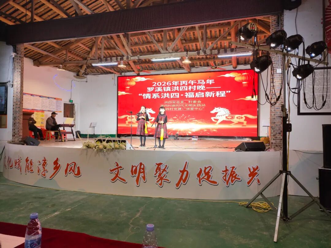 夜幕降临,洪四影剧院灯火通明。“情系洪四·福启新程”丙午马年迎新春联欢晚会精彩上演。晚会在激昂的开场鼓《龙腾虎跃》中拉开帷幕。随后,南音独唱《孤栖闷》、朗诵《是,你泉州》、舞蹈《再唱山歌给党听》等节目轮番上演,现场洋溢着浓浓的年味与乡情。