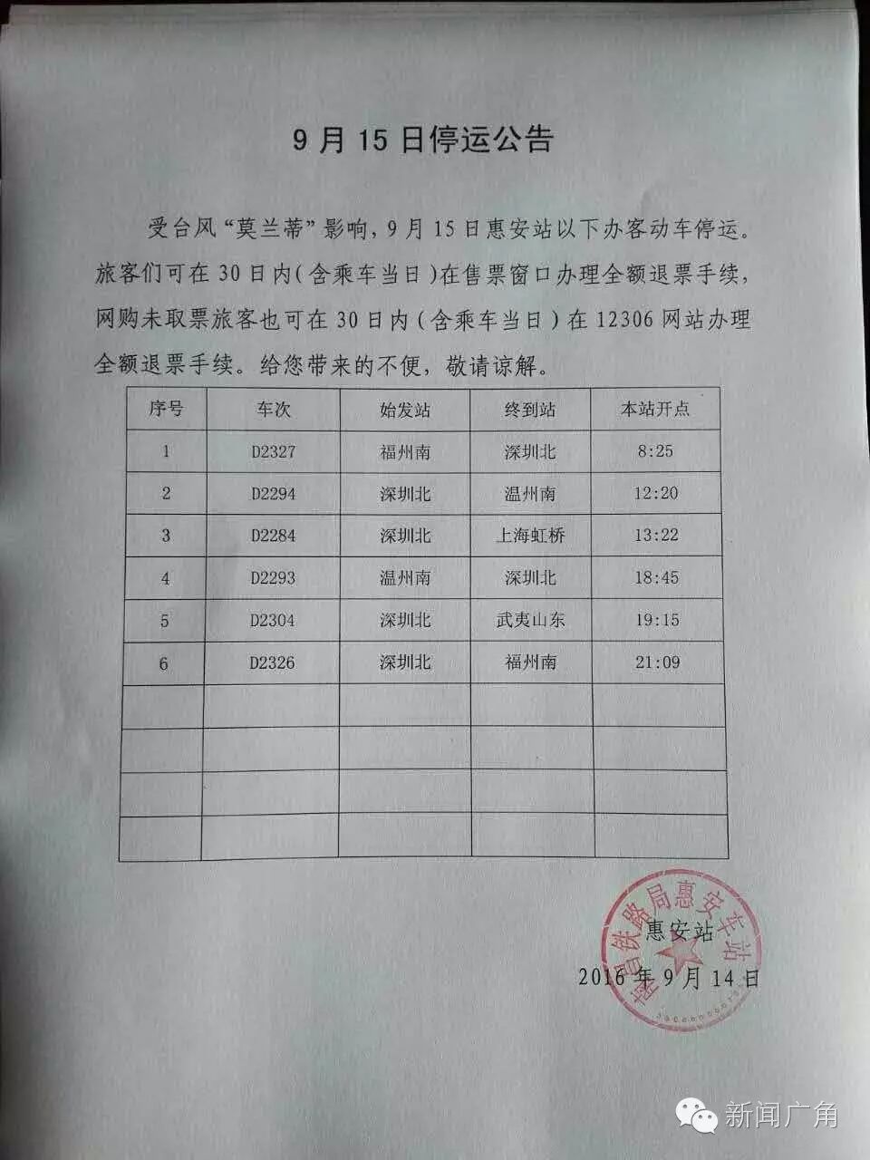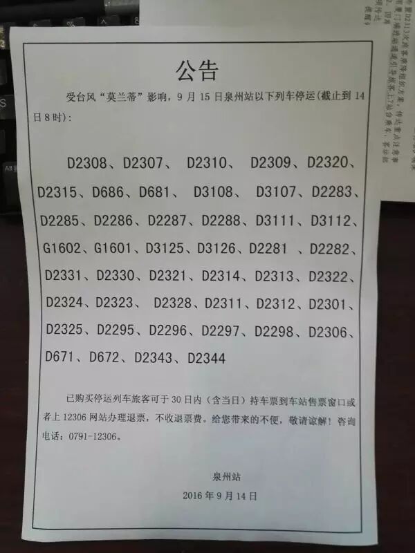 受台风影响,预计15日泉州动车站停运43趟列车、晋江动车站停运11趟、惠安站停运6趟。买了这些停运列车车票的旅客,可携带身份证在30天内可到窗口或12306官网免费退票。
