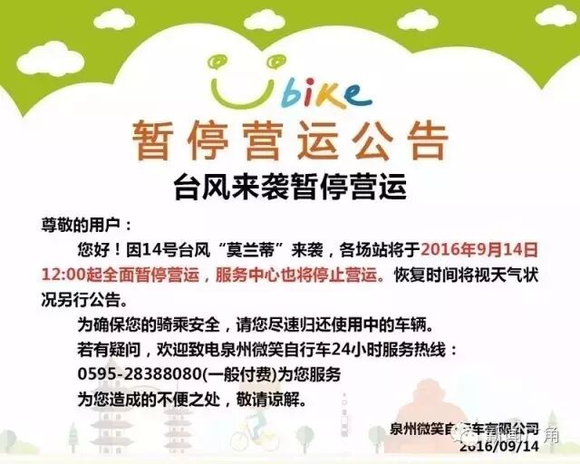 今天中午12点起,微笑自行车暂停营运,请未及还车的市民朋友尽快归还。