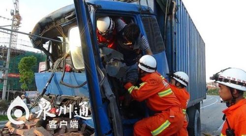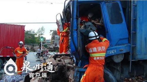 泉州一货车追尾撞上运砖车 司机双脚受伤被困(图)