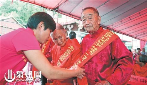 活动现场,老人们观看了虎邱镇为庆祝重阳节精心编排的文艺节目。随后,该镇10对身着唐装的钻石婚、金婚“幸福夫妻”和7位“最美老人”接受了安溪县相关负责人送上的匾牌和鲜花。