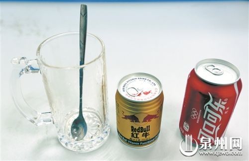 一瓶红牛、一瓶可口可乐、一个玻璃杯、一把勺子