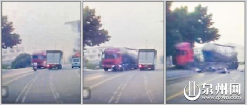 监控视频显示,事发时三名初中生骑着摩托车原靠右行驶,但为了超过前方的一辆小货车,摩托车往左车道超车,与对向驶来的罐车猛烈撞击,三人瞬间倒地。(13日永春车祸视频截图)