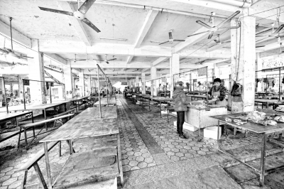 12月2日下午,记者到丰州镇综合菜市场,并没有看到肉贩的身影。而嘉彩菜市场原本是肉摊最集中的市场,但此时市场显得人员稀少。