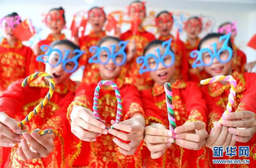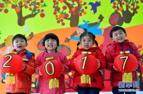 12月30日,湖北省保康县直机关幼儿园的小朋友手拿印有“2017”字样的红灯笼合影,迎接新年的到来。新华社发(杨韬 摄)