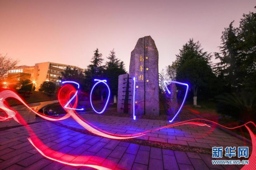 12月30日晚,在湖南省衡阳市南华大学校园,大学生摄影爱好者用光绘摄影创作出“2017”字样,迎接新年的到来。