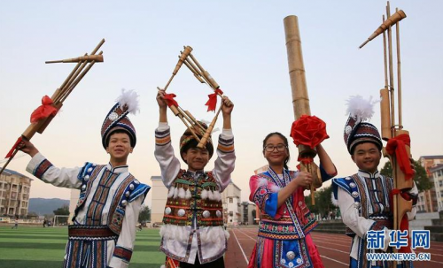 12月30日,在广西融水苗族自治县民族中学,学校芦笙队队员用乐器摆出“2017”字样,喜迎新年。新华社发(龙涛 摄)