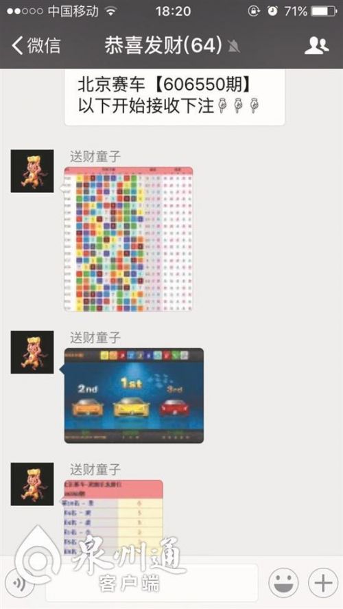抢红包是当下微信的普遍生态,陈先生不觉得奇怪,就进去看看。果然,他进群没多久,就有人发了好几个大红包,每次他都能抢到几元至一二十元。很快,他发现,群里不时有人刷出投注情况——这个名为“福利群”的微信群,实际上是个“博彩群”。几分钟后,一个名为“财富管理”的人加了他。“财富管理”说,这是“赛车”,让他多看看别人怎么玩、怎么投注,“来钱很快的”。