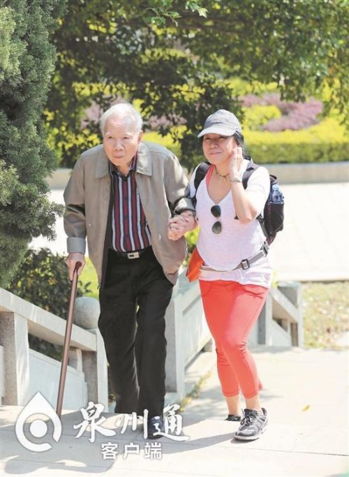 昨日上午10时许,一位白发苍苍的老者在一位女士的搀扶下,拄着拐杖,两步一个台阶,慢慢往上走。“这是第五排,在第十排,走,继续往前走。”老人抬头看了一眼,蹒跚向前。